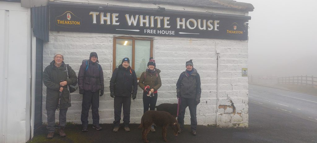 Started from the White House on a very misty February day with visibility down to 20 yards all the way to Marsden. Fortunately we took the usual route, which most of us are very familiar with, over Robin Hoods bed towards the M62. Tricky walking with many rocks having a thin layer of frozen mist on them. Thankfully a lot more of the path to the M62 and beyond has been flagged. Took the opportunity to take an extra coffee stop at the sheep shelter just after Robin Hoods bed before taking a second one at the usual stop on Marsden moor. Not much to see in the mist as evidenced by the photos or the lack of them, thankfully the rain held off. I have included a view of Marsden from a previous walk ( Nov 21) to illustrate what was missed for those new to this area. Eventually descended into Marsden where the mist had lifted and and we could take lunch alongside the river and pack horse bridge. Not at it’s picture perfect best due to flood defence work being carried out. From there to the Riverhead brewery for a well earned pint. As the bus timing didn’t suit the curry times we caught an earlier bus and called in Weatherspoon’s at Oldham. A couple of cheaper beers in there and the tram to Milnrow where Arif and Clint joined us for a very nice curry.