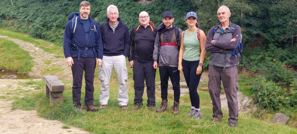 A very clear April day ideal for photos saw us starting on what became famous as Bill’s death walk from Norden Tram Terminus. Used the footpath that took us over the top of the Naden reservoirs up a dry river bed and up some steep cliff faces that several members thought a bit dangerous onto Scout Moor before desending to the Owd Betts for lunch. The afternoon saw us walk down Ashworth Valley for a Curry at the True taste of India.